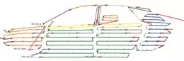 为实现面漆B2一遍成膜的整车喷涂验证,经过对机器人仿形轨迹进行了系统优化调整,重点关注边角等区域,经调整后的机器人仿形(以瑞风S5为例)如下图2所示: